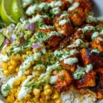 A vibrant chicken rice bowl featuring smoky, charred corn, and a creamy cilantro-lime sauce, perfect for quick weeknight meals or gatherings.
