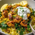 Imagine sinking your fork into a tender piece of chicken, the spices forming a delightful crust that gives way to juicy, succulent meat. The rice forms a soft, pillowy bed, each fluffy grain infused with savory depth and a touch of tang from the lemon. As you take a bite, the warmth of ginger and the earthiness of turmeric envelop you, while the cooling touch of Greek yogurt balances the heat with its creamy richness. Each mouthful is a celebration, a feast of flavors that captures the essence of comfort food while nurturing your body with anti-inflammatory goodness.