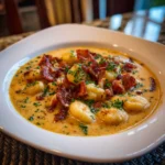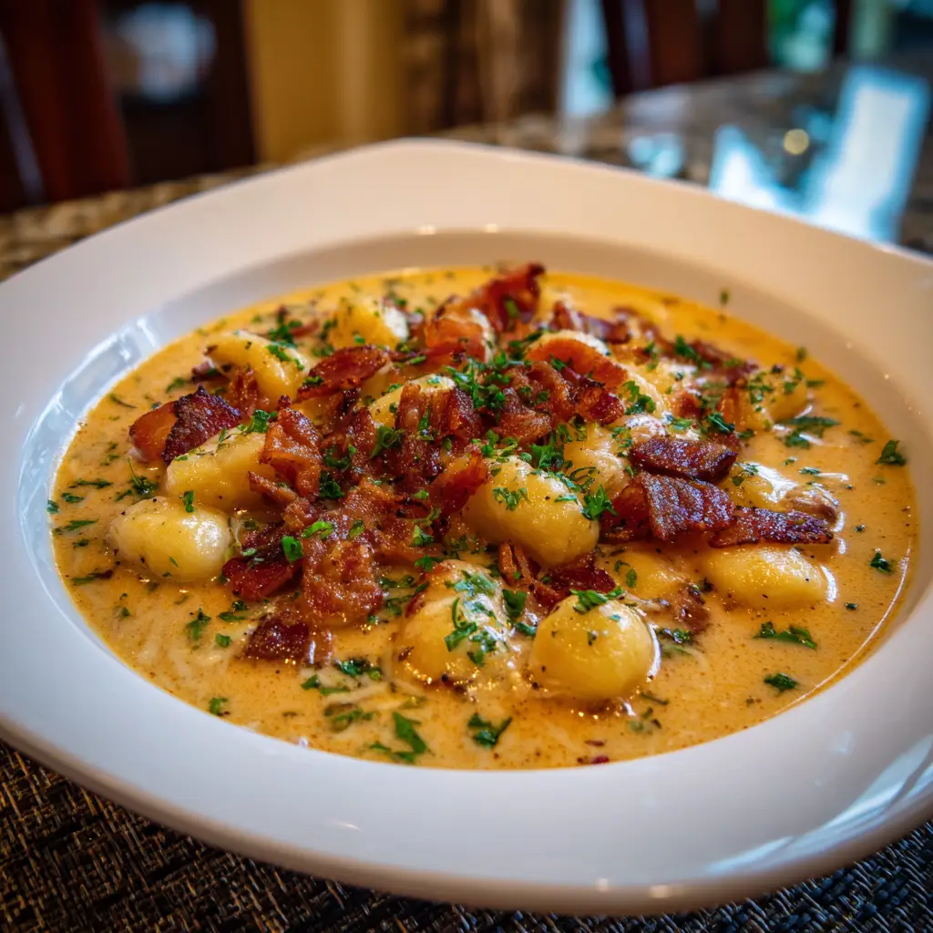 A rich and creamy soup featuring tender gnocchi, crispy bacon, and melted cheddar cheese, perfect for a comforting meal.