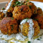 Crispy lentil meatballs paired with a creamy tzatziki sauce, offering a vibrant taste of Mediterranean cuisine.