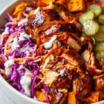 Delicious BBQ Chicken Bowls layered with tender shredded chicken, caramelized sweet potatoes, and crunchy coleslaw.