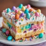 A festive and vibrant poke cake perfect for Easter celebrations, featuring fluffy layers infused with sweetened condensed milk and colorful sprinkles.