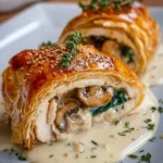 A comforting and elegant Chicken Wellington featuring succulent chicken, earthy mushrooms, and fresh spinach, all enveloped in a flaky puff pastry and drizzled with a tangy Dijon cream sauce.