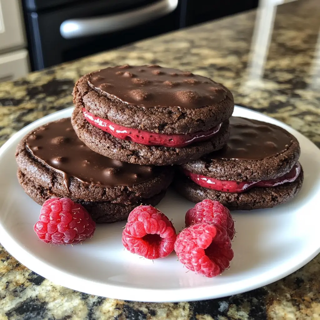 Delicious chocolate cookies filled with a sweet raspberry filling, perfect for any occasion.