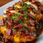 A delicious dish that combines smoky BBQ flavors, crispy bacon, and creamy melted cheddar over tender chicken breasts, perfect for any occasion.
