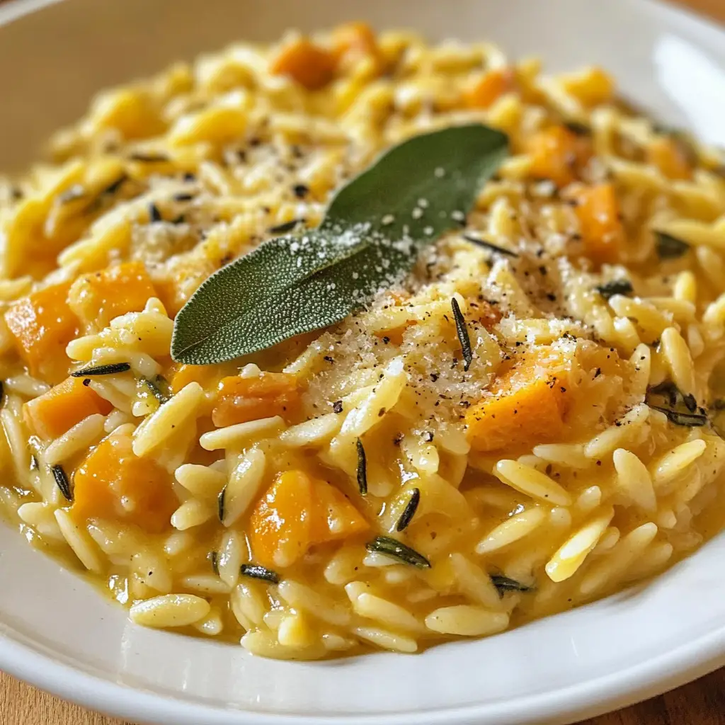 A delicious and creamy orzo dish infused with pumpkin and sage, perfect for fall.
