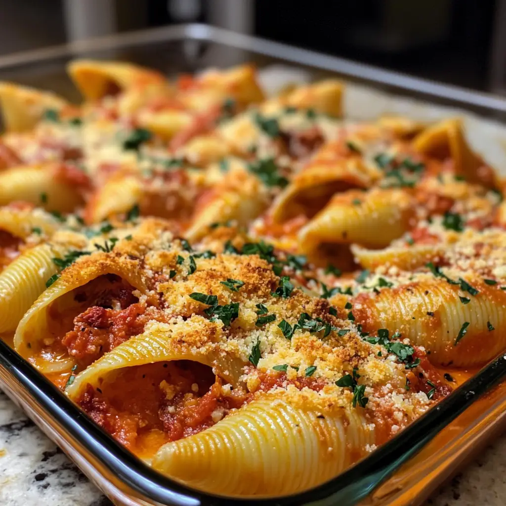 A delicious and creamy pasta dish featuring large shells stuffed with a flavorful mixture of ricotta cheese and sun-dried tomatoes, topped with a rich sauce.