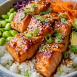 Assemble the Bowl: Divide your cooked rice into bowls and crown each with the crispy salmon, avocado slices, cucumber, shredded carrots, and edamame.