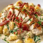 A creamy and comforting dish featuring tender chicken, crispy bacon, and pillowy gnocchi in a rich ranch sauce.