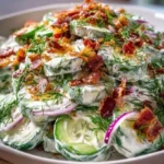 A refreshing and crunchy salad featuring crisp cucumbers, creamy ranch dressing, and crispy bacon, perfect for summer gatherings.