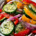 One mouthful of this salad and you will understand its allure. The cucumbers deliver a refreshing crunch against the backdrop of the tender, juicy peppers. A light drizzle of olive oil brings a silky richness, while the vinegar adds just enough tang to elevate every bite. It’s perfect for summer barbecues, family picnics, or as a side dish on a cozy weeknight dinner. You can also enjoy it as a light lunch, brimming with vitamins and minerals that nurture your body, making it a guilt-free indulgence.