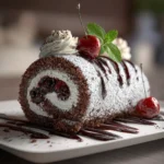 A luxurious and indulgent dessert that combines the rich flavors of chocolate cake with cherries and whipped cream, all rolled into a beautiful cake roll.