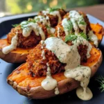 - Drizzle the garlic dill sauce over the stuffed sweet potatoes.