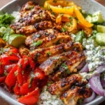 Delight in a wholesome and flavor-packed meal with Greek Chicken Bowls featuring marinated chicken, fresh vegetables, creamy feta, and zesty tzatziki sauce.