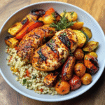 Keywords: Harissa Grilled Chicken, Couscous, Roasted Veggies, Mediterranean Recipe