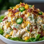 Nutritionally speaking, this salad delivers. Packed with protein from the chicken and cheese, it keeps you energized and satiated, making it ideal for lunch, a light dinner, or even a delicious snack. The beautiful colors—bright green from fresh jalapeños, golden bacon crumbles, and creamy white cheese—catch your eye, turning an ordinary meal into a feast that’s as pleasing to the eye as it is to the palate.