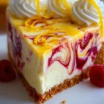 A delightful cheesecake featuring a creamy filling with vibrant raspberry and lemon swirls, all resting on a crunchy graham cracker crust.