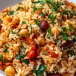 A vibrant dish combining fluffy rice and creamy beans with fresh vegetables and Mediterranean spices, perfect for any occasion.