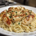 A delicious and creamy one-pot dish featuring tender chicken, orzo pasta, and a rich garlic parmesan sauce.