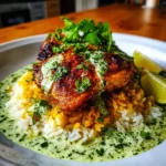 Finally, it’s time to plate your masterpiece! Serve the chicken over a generous scoop of rice. Drizzle the vibrant green sauce on top, letting it cascade down the sides. This dish is not just a meal; it’s a feast for the eyes and the taste buds. Enjoy every bite!