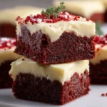 Delightful red velvet brownies topped with luscious cream cheese frosting, perfect for any celebration.