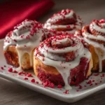 Delicious and festive red velvet cinnamon rolls perfect for Valentine’s Day.