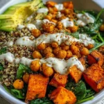 - Assemble your bowl by placing a generous scoop of quinoa at the base, followed by roasted sweet potatoes and chickpeas. Layer on fresh spinach and avocado slices, and drizzle with the creamy tahini-yogurt dressing.