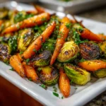 Pop the baking sheet into your preheated oven and roast for 25-30 minutes. Halfway through, give the veggies a good stir to ensure even cooking. You’ll know they’re done when they’re tender and caramelized. A fork should easily pierce through the carrots and Brussels sprouts, and they should have a lovely golden hue.