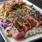 This recipe is a game-changer for busy nights! It’s quick to prepare, taking just 20 minutes from start to finish. The combination of tender seared tuna, creamy spicy mayo, and crunchy cabbage slaw creates a symphony of flavors and textures. Plus, it’s a healthy option that doesn’t skimp on taste. You’ll feel like a culinary rockstar without the stress of complicated cooking!