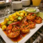 A refreshing and vibrant dish featuring succulent shrimp, creamy avocado, and a zesty mango salsa, all drizzled with a tangy lime-chili sauce.