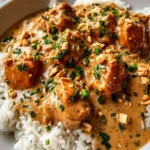 A comforting dish featuring tender chicken thighs simmered in a creamy coconut and peanut sauce, perfect for serving over rice or noodles.