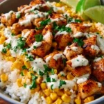 A vibrant rice bowl featuring juicy chicken, sweet corn, and a zesty cilantro-lime crema that brings the essence of Mexican street food to your dining table.
