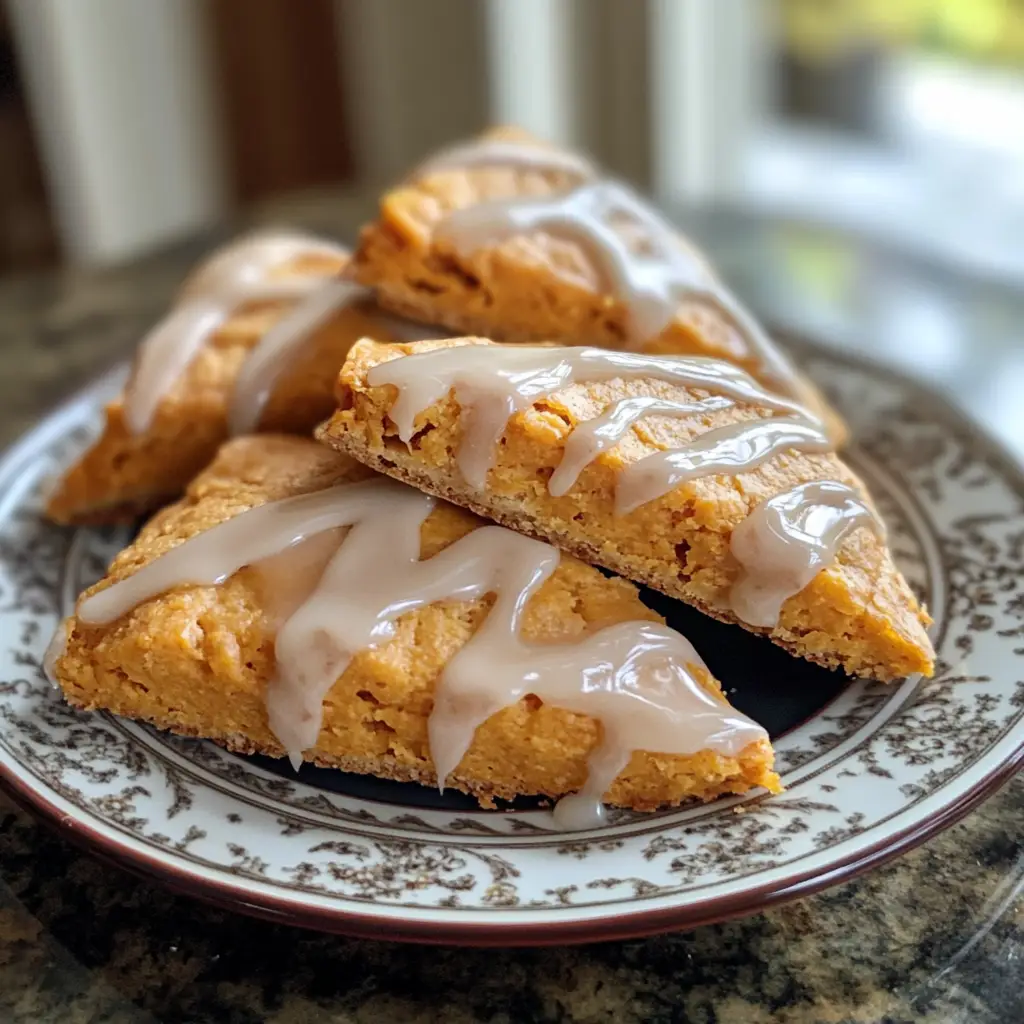 Deliciously spiced sweet potato scones topped with a creamy vanilla glaze, perfect for breakfast or a snack.