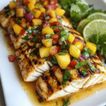 A delicious and healthy dish featuring grilled halibut topped with a fresh mango pico de gallo.
