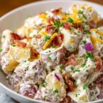 A creamy, flavor-packed potato salad bursting with flavors inspired by classic steakhouses, featuring crispy bacon and sharp cheddar cheese.