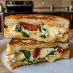 A delicious grilled cheese sandwich filled with sun-dried tomatoes, spinach, and ricotta cheese, perfect for a quick meal.