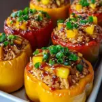 The moment you pull the Sweet and Savory Teriyaki Pineapple Chicken and Rice Stuffed Peppers from the oven, a delightful wave of aroma envelops your kitchen. The fragrant notes of garlic mingle effortlessly with the sweet scent of caramelized pineapple and the rich umami of teriyaki sauce, creating an inviting and irresistible atmosphere. As you slice into the tender, vibrant bell peppers, the color bursts from within: a warm golden chicken-and-rice filling beckoning from within the folds of the pepper, generously laced with juicy pineapple tidbits. This dish promises not only a feast for your taste buds but also a visual delight that makes every bite feel like a celebration.